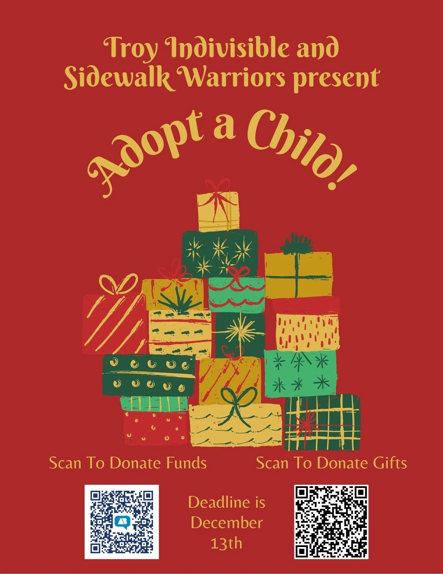 Troy Indivisible is working with Sidewalk Warriors to sponsor two families with Christmas gifts