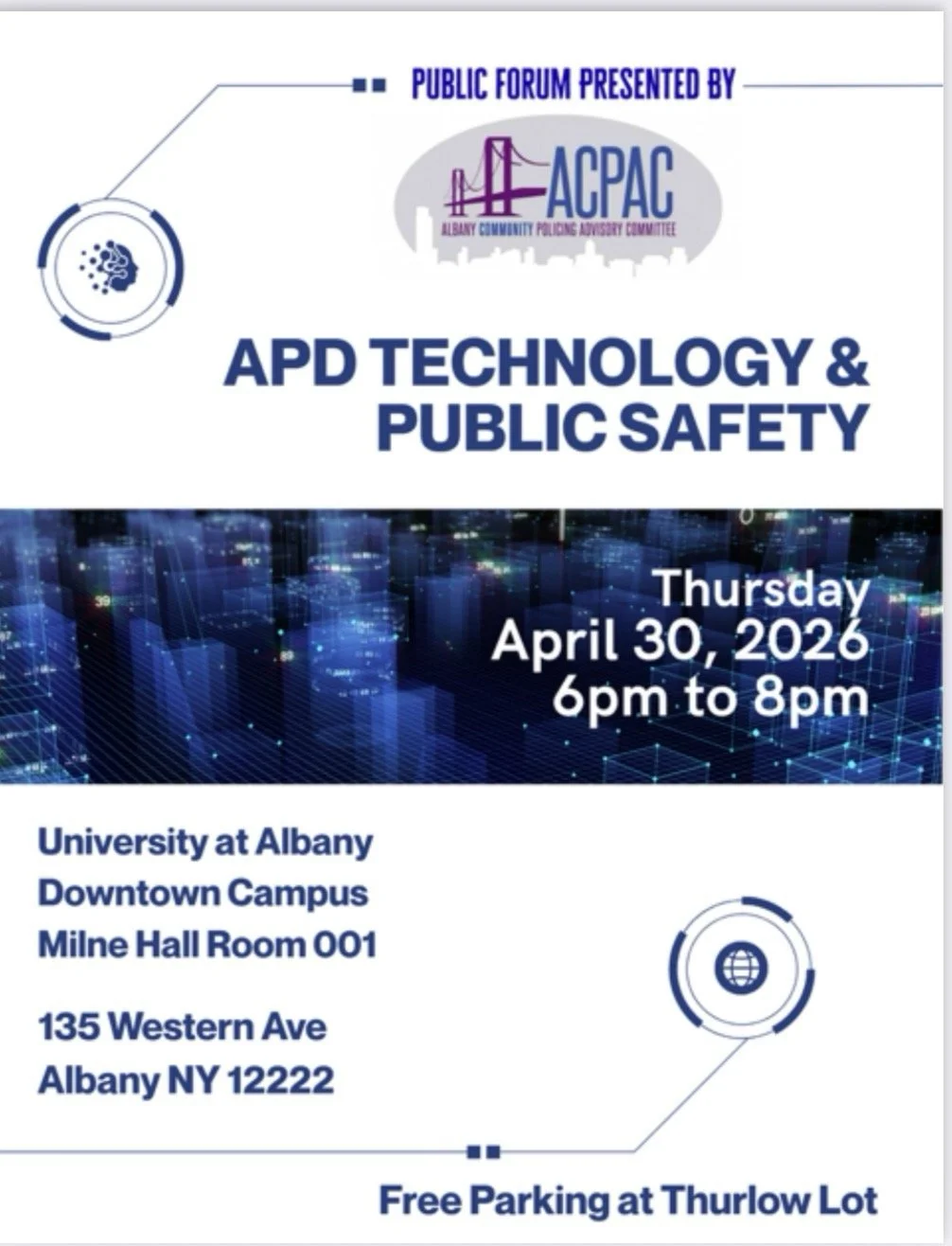 Albany PD Technology & Public Safety Public Forum Thursday, April 30, 2026 6:00 PM 8:00 PM UAlbany Downtown Campus, Milne Hall, Room 001 135 Western Avenue Albany, NY, 12203 United States (map) Google Calendar ICS