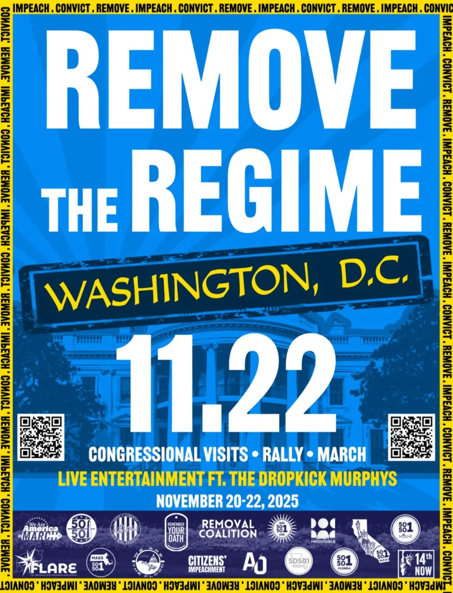 Capital Region to DC - Remove the Regime Saturday, November 22, 2025 5:00 AM Sunday, November 23, 2025 12:00 AM Crossgates Commons 161 Washington Avenue Extension Albany, NY, 12205 United States (map) Google Calendar ICS Remove the Regime is a month-long campaign that culminates in a rally on the National Mall on November 22nd. Join your fellow Indivisible members on the bus down to DC to demand that the Trump regime come to immediate end. Sign Up for The Bus!