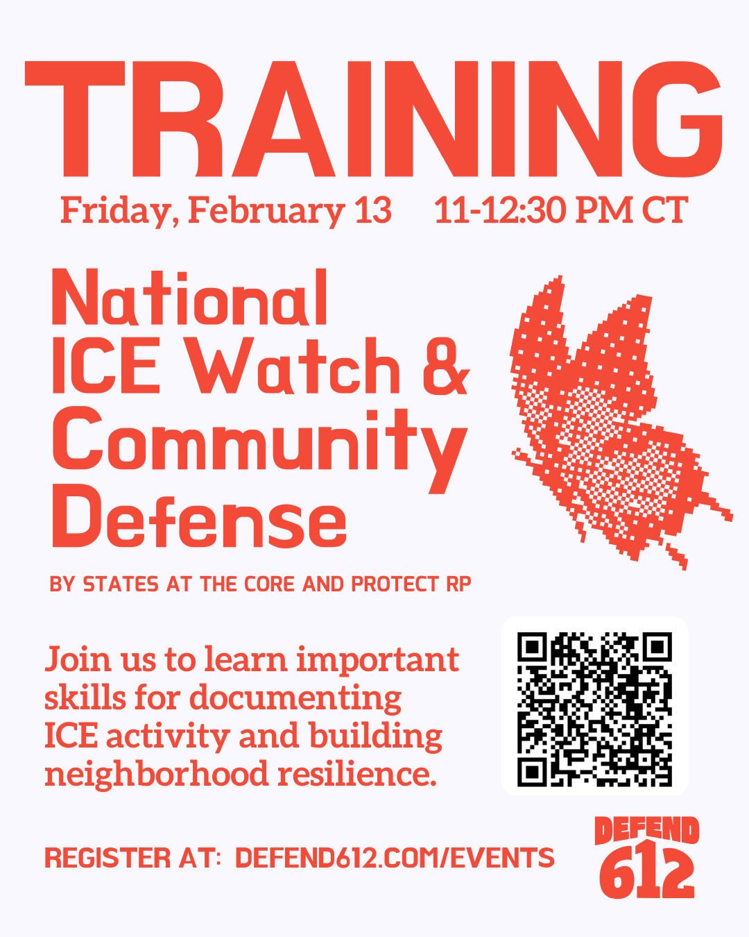 Join this 90-minute training from States at the Core and Protect RP on effectively protecting your neighborhoods from federal enforcement incursions. ICE Watch and other rapid response tactics are key strategies being used by people across the country to protect their communities against aggressive activity from federal law enforcement agencies like ICE and Border Patrol. Whether or not you are part of an established community response network, this training will share important skills for building neighborhood resilience, documenting ICE activity, and supporting neighbors. In addition to covering the basics of ICE Watch, we will discuss new analysis on ICE operations, rapid response tactics, and safety guidance.