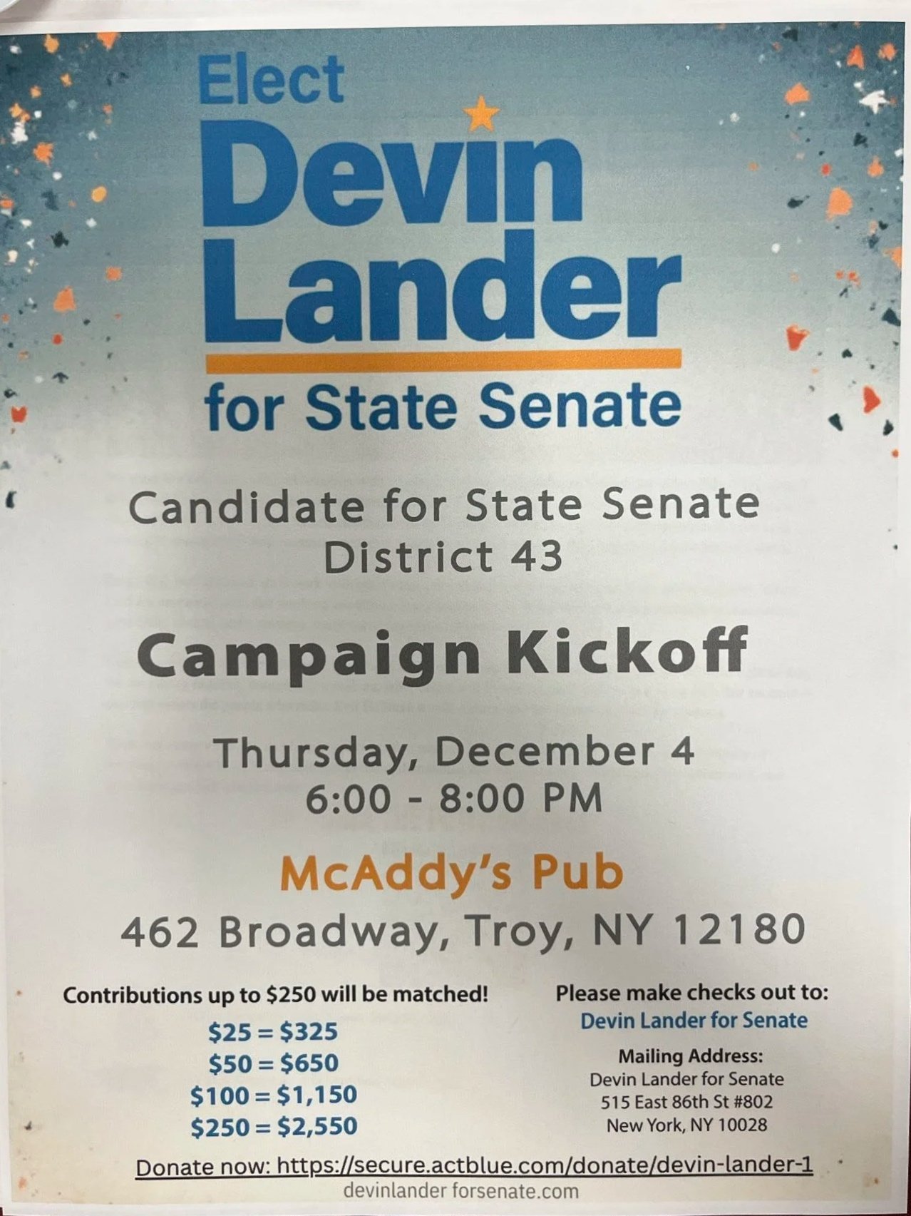 Devin Lander is New York’s 16th State Historian and is a Democratic candidate for State Senate in the 43rd District, looking seeking to unseat MAGA incumbent Jake Ashby. In addition to the entirety of Rensselaer and Washington Counties, the 43rd State Senate District also includes northeastern Albany County, including Colonie and the Albany County Rivertowns of Green Island, Cohoes, Watervliet and Menands.