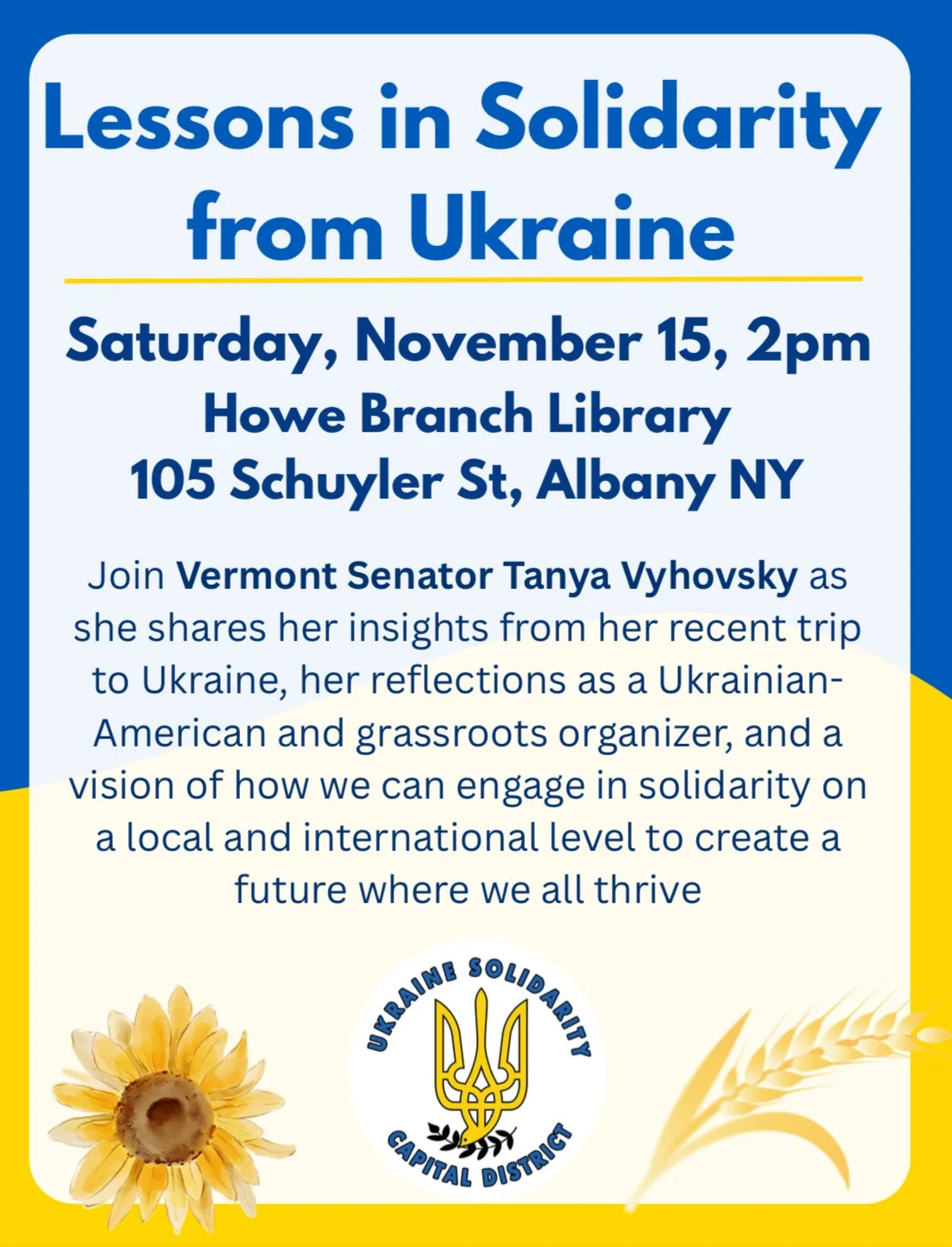 Join Vermont Senator Tanya Vyhovsky as she shares her insights from her recent trip to Ukraine, her reflections as a Ukrainian-American and grassroots organizer, and a vision of how we can engage in solidarity on a local and international level to create a future where we all thrive.