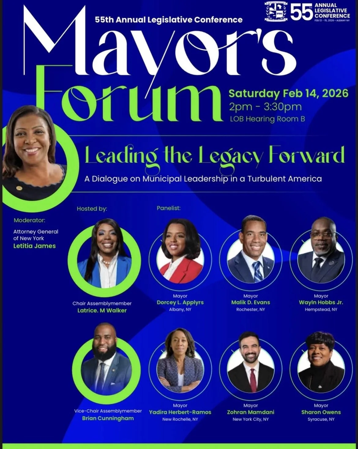 Mayors' Forum: Leading the Legacy Forward Saturday, February 14, 2026 2:00 PM 3:30 PM Legislative Office Building; Hearing Room B Empire State Plaza, State Street Albany, NY 12223 United States (map) Google Calendar ICS