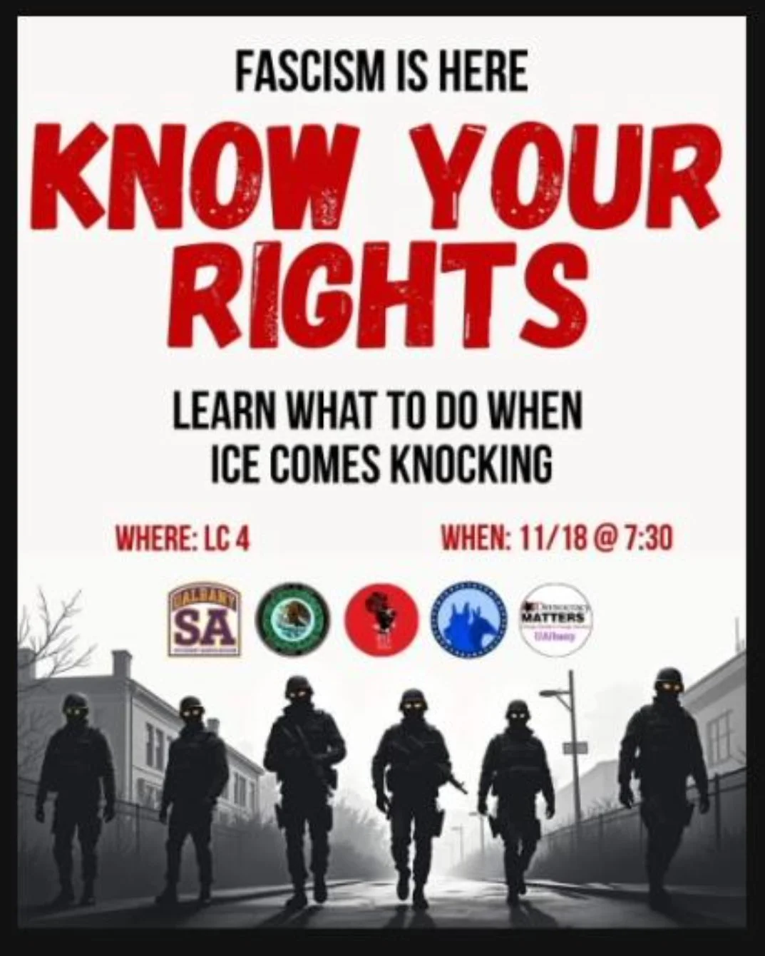 Join YDSA, the Capital Region Sanctuary Coalition @518crsc, UAlbany Mexa @ualbanymexa , UA College Democrats @ualbanydems , and Democracy Matters @democracymattersualbany for our Know Your Rights program on Tuesday November 18th, 2025 @ 7:30 in Lecture Center 4.