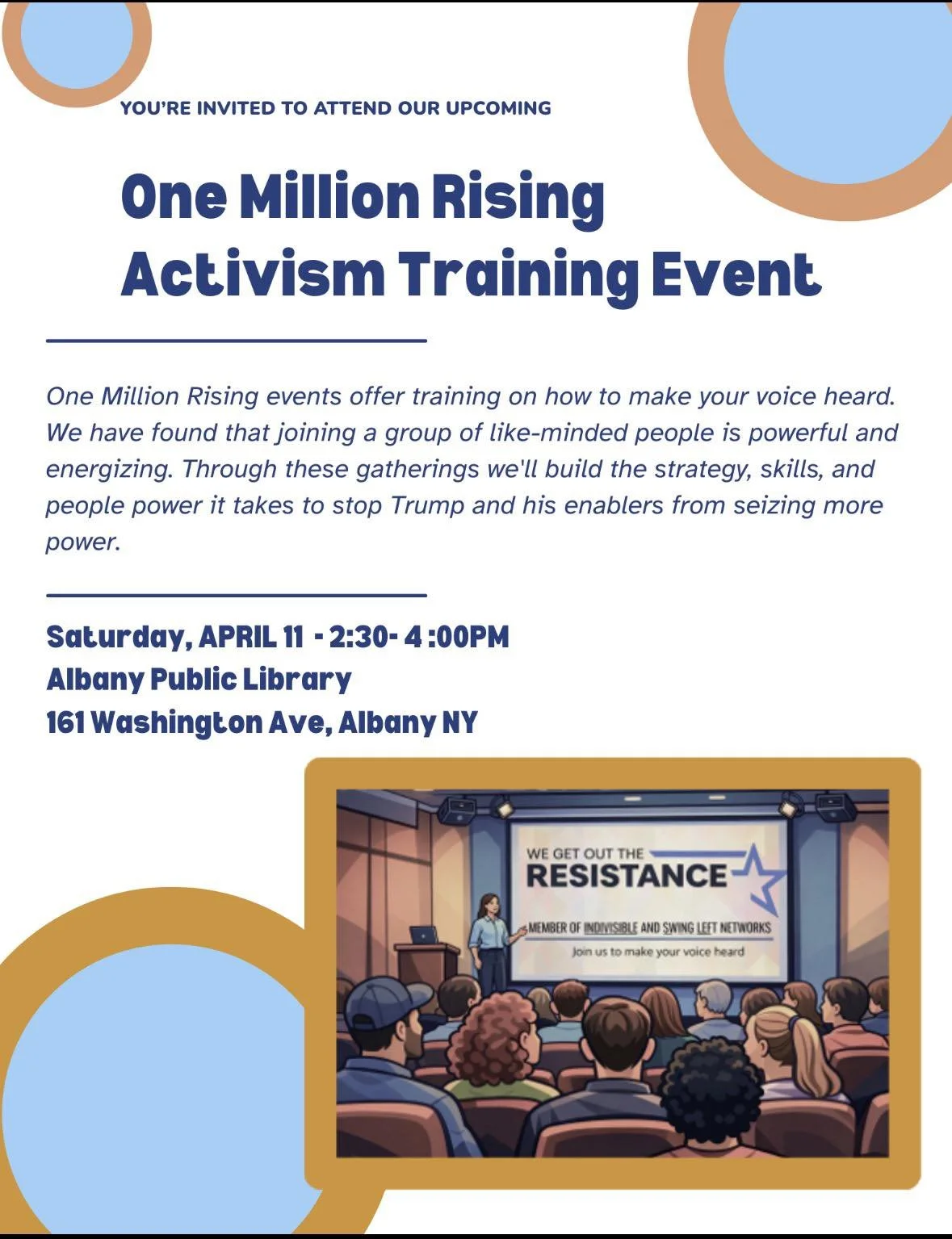 One Million RISING: A Call to Action! Saturday, April 11, 2026 2:30 PM 4:00 PM Albany Public Library 161 Washington Avenue Albany, NY, 12210 United States (map) Google Calendar ICS This event is hosted by our friends at We Get Out the Resistance and will outline actions you can take to resist the Trump Regime, keep our neighbors safe from ICE, support Democrats to win the 2026 mid-term elections and more. Learn more