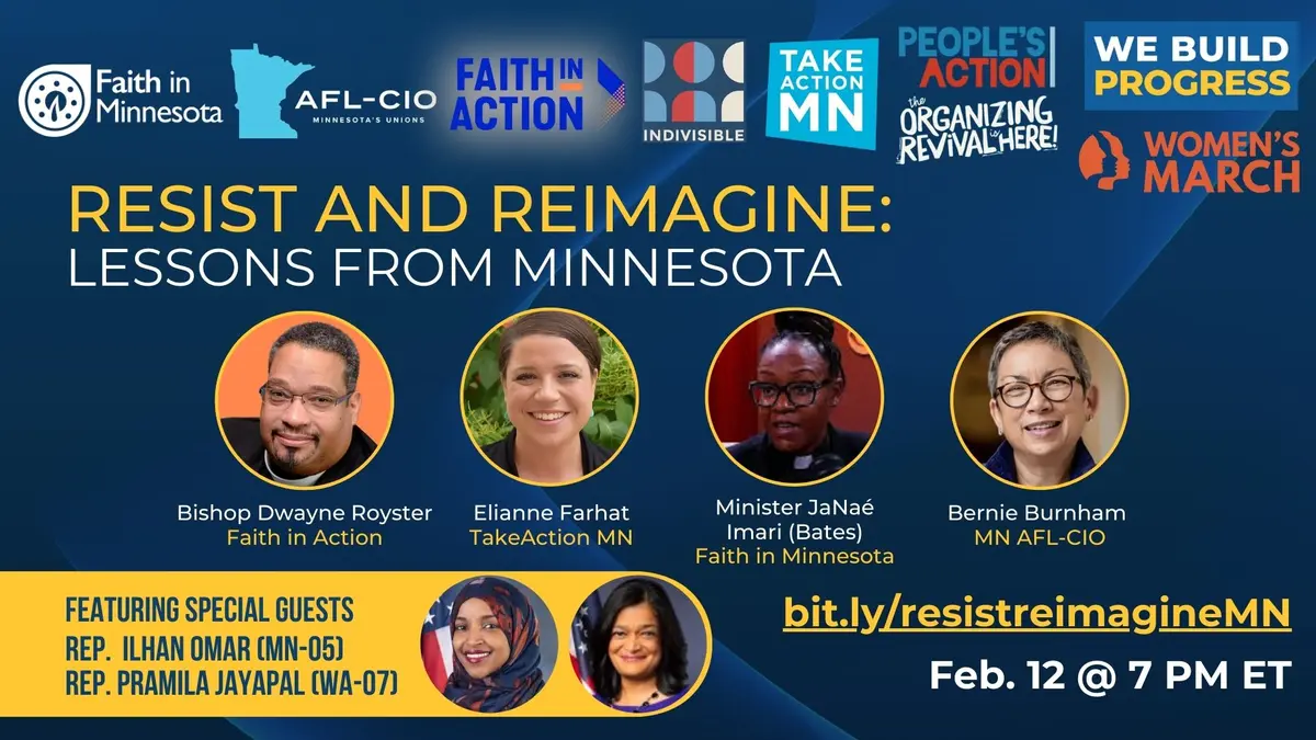 Organizers and community members in Minnesota are transforming crisis into action and tragedy into solidarity. Join us for a conversation with labor and community leaders from Minnesota including Reps. Ilhan Omar (MN-5), Pramila Jayapal (WA-07) and special guests. They’ll share practical lessons for fellow organizers on organizing in the midst of crisis, rapid response, economic solidarity actions, and how Minnesota’s experience can help other communities prepare to protect each other. Don't miss this community conversation hosted by We Build Progress, Take Action Minnesota, Minnesota AFL-CIO, Faith in Minnesota, People’s Action, Faith In Action, the Organizing Revival National Networks, Women's March and Indivisible!