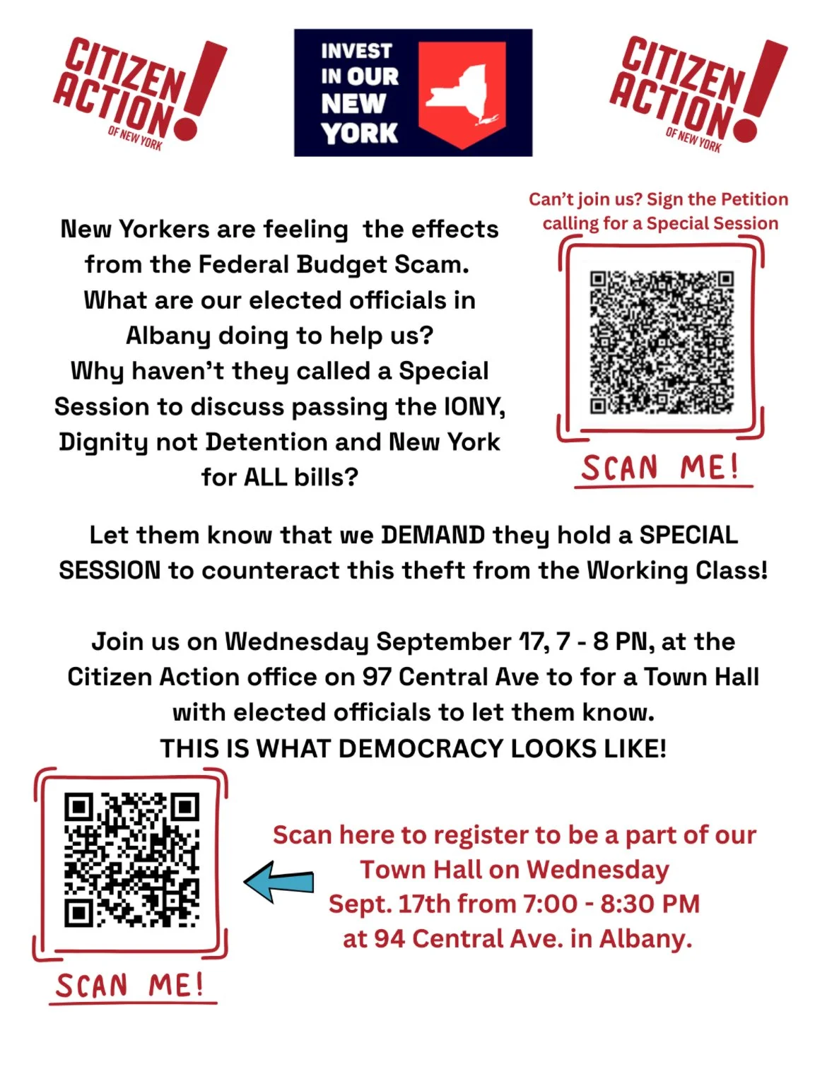 Special Session Town Hall Wednesday, September 17, 2025 7:00 PM 8:30 PM Citizen Action 97 Central Avenue Albany NY United States (map) Google Calendar ICS