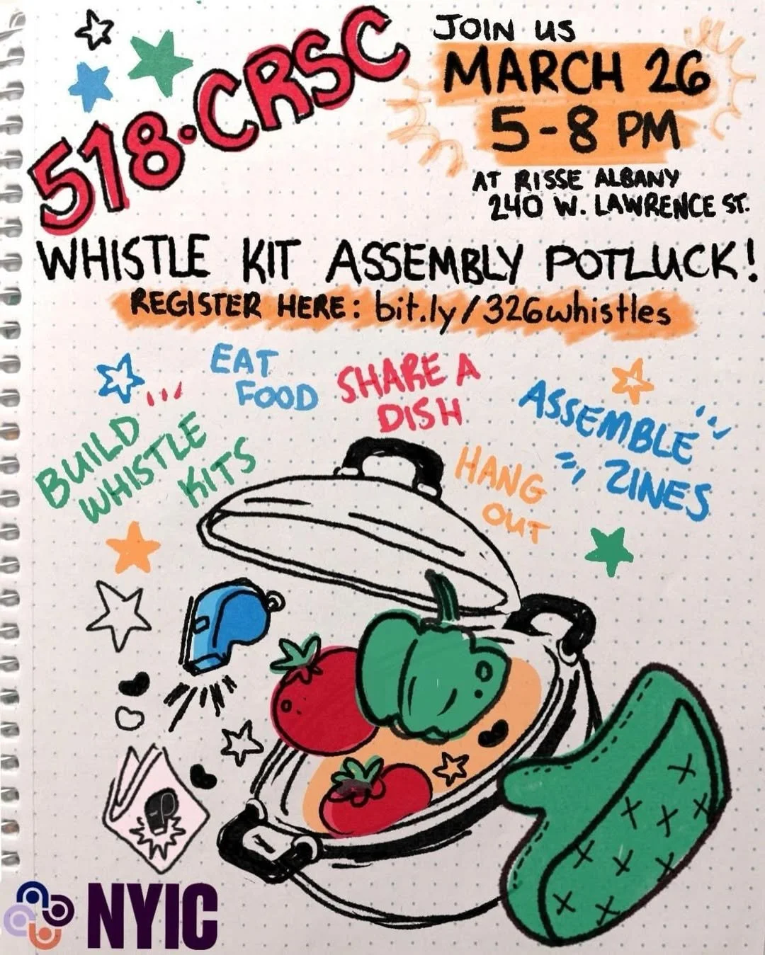 Join the Capital Region Sanctuary Coalition in a night dedicated to learning about — and helping pack— whistle kits to distribute throughout the Capital Region! We have learned so much from the bravery of those on the ground in Minneapolis protecting their immigrant neighbors, and it is clear: Whistles work! While packing our kits, we’ll enjoy some music, delicious food and chill vibes.