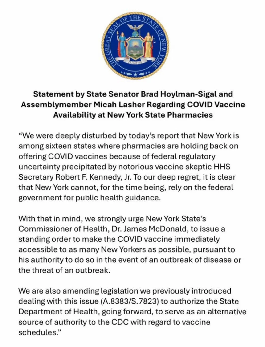 Specifically in New York, Assembly Member Micah Lasher has introduced a bill (A8383) which will eliminate the need for this state to follow the CDC requirements for immunization against COVID-19. The bill was originally introduced in May 2025 and aimed specifically for immunization against meningococcal disease. According to a recent press release by AM Lasher and Senator Brad Hoylman-Sigal, language in both the Senate and Assembly Bills will soon be amended to broaden the diseases covered.