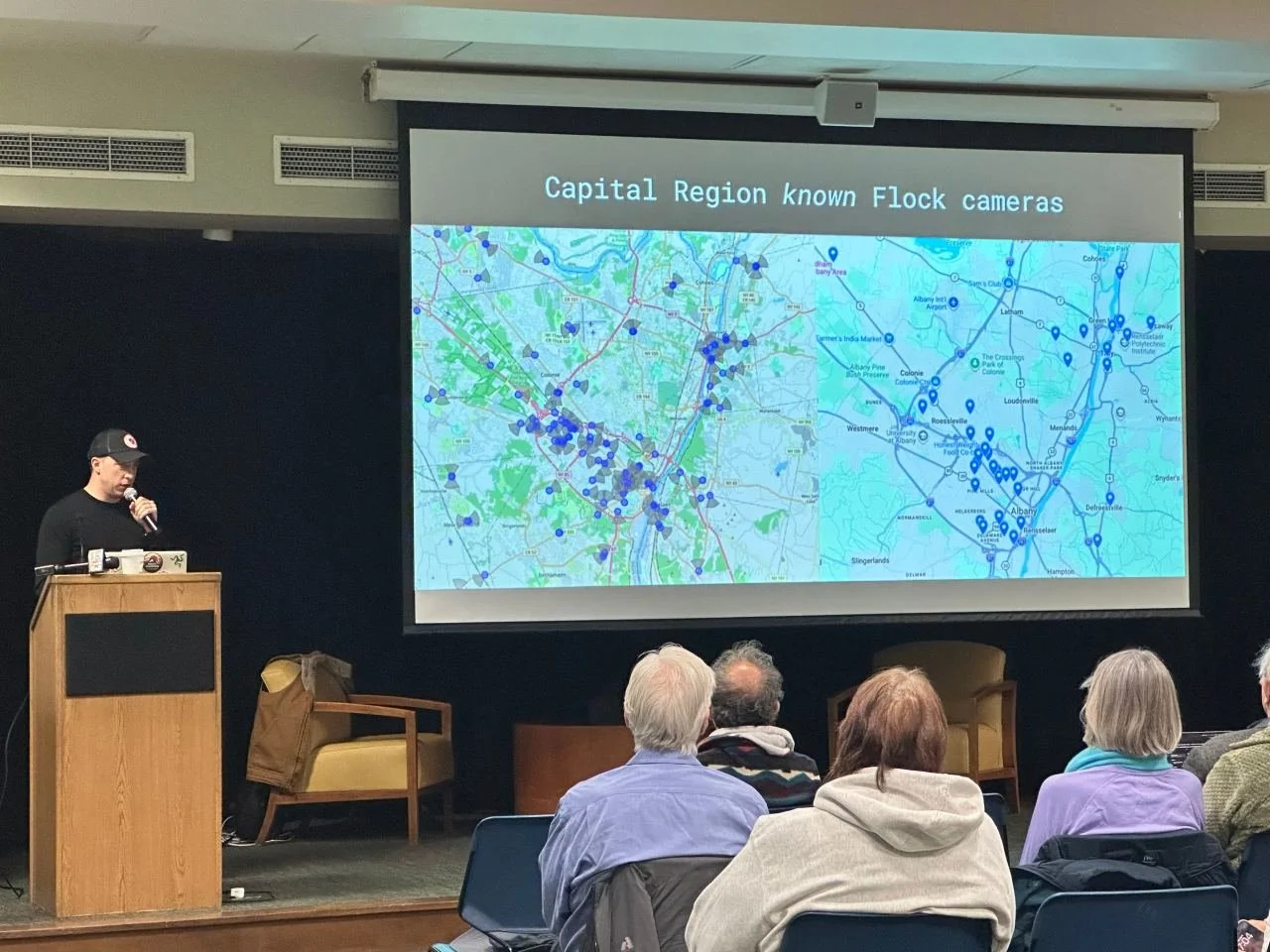 But, please remember, Flock cameras are not just a Troy issue, because these surveillance systems are in virtually every community within the greater 518. Just this past week, Indivisible Albany took our show on the road to Saratoga Springs, where we joined with our comrades in Indivisible ADK/Saratoga for yet another anti-Flock educational forum. Everywhere we go with this presentation, we see the same thing in the audience; stupefied shock at the scope of the issue, confusion about how and why this has happened under the noses of our elected officials — Republicans and Democrats alike, by the way — and a demand to know what can be done to stop it. Frankly, this issue obliterates party lines because nobody wants to be watched 24/7 by the government or by a data-aggregating company who takes taxpayer money to spy on us all and then sell our data to the highest bidder. And, as the DeFlock Troy movement makes abundantly clear, it is clear that young people are particularly attuned to the issue of the mass surveillance state; they see their future freedoms being given over to AI and anti-democratic corporations like Flock and Palantir and they know, better than most, that the fight for their future starts in the here and now. So, if you are reading this and are curious about Flock in your own Capital Region community, drop us a line. We’d be more than happy to give a presentation in your community and to help you build a local working group to tackle the issue from the ground up. Flock surveillance systems are not going away of their accord, they are only becoming more entrenched and more interconnected, and sometimes they even stick around when the municipality tells them to go; the responsibility to lead the fight against Flock surveillance belongs to you, and that fight starts now.