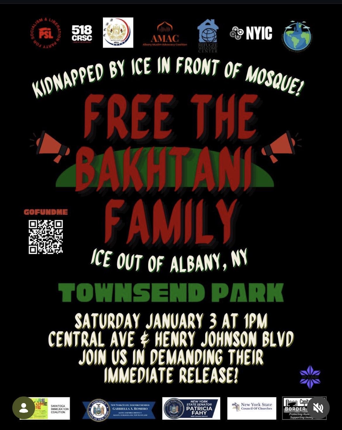 On Saturday January 3, we’re standing with Senator Patricia Fahy, Assembly Member Gabriella Romero, the Albany Muslim Advocacy Coalition, the Capital Region Sanctuary Coalition and host of other local sponsors in support of our neighbors the Bakhtani family, four of whom have been in ICE custody since early December. For background on the plight of the Capital Region Afghan community, we highly recommend this excellent piece by the Times Union’s Maria Silva.