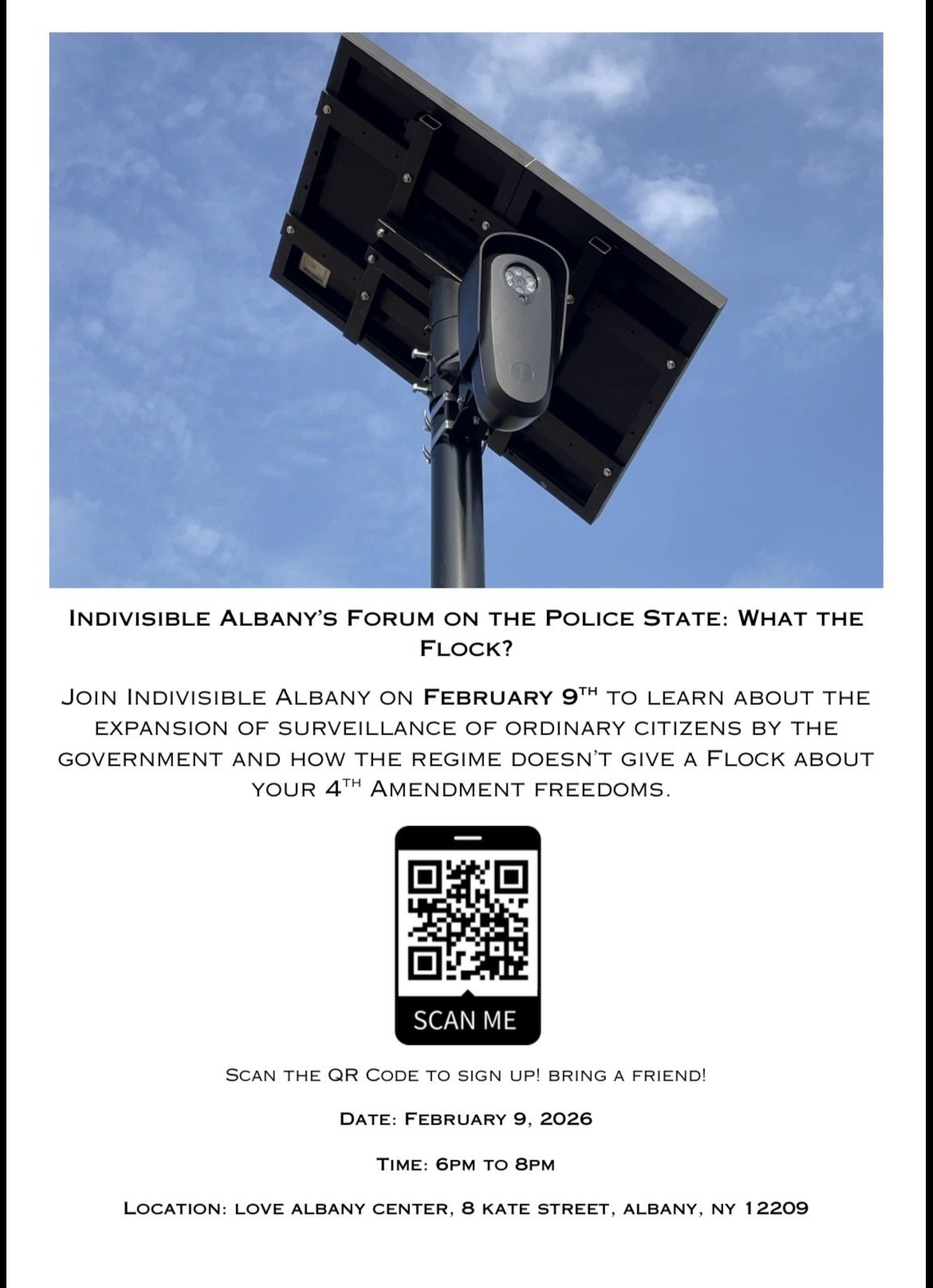 We’re starting this week’s installment with a reminder about tonight’s Monthly Member Meeting at The Love Albany Center at 8 Kate Street in the City of Albany. We’re really excited about tonight’s meeting for three reasons. First, this is our first Member Meeting of 2026 and, second, it is the first-ever meeting at our new gathering spot within the Albany City limits at The Love Albany Center. But we’re most excited to present our Forum on the Police State: What the Flock?, where we will discuss how Flock camera systems work, where they are, how the data is retained and, most importantly, how this data is being funneled to federal agencies such as Border Patrol and ICE to target and track immigrant communities. We will also discuss actions that you can take to fight back against the installation of Flock cameras and demand accountability for those already in use. It’s not too late for you to let us know you’ll be attending this important and informative discussion of the rapidly expanding surveillance state, including right here in the Capital Region. In case you are unfamiliar with The Love Albany Center in Albany’s Delaware Neighborhood, here is a map; it’s only a block or so away from the intersection of Delaware Avenue and Whitehall Road, with a dedicated parking lot off of Kate Street and additional parking behind 73 Whitehall Road.