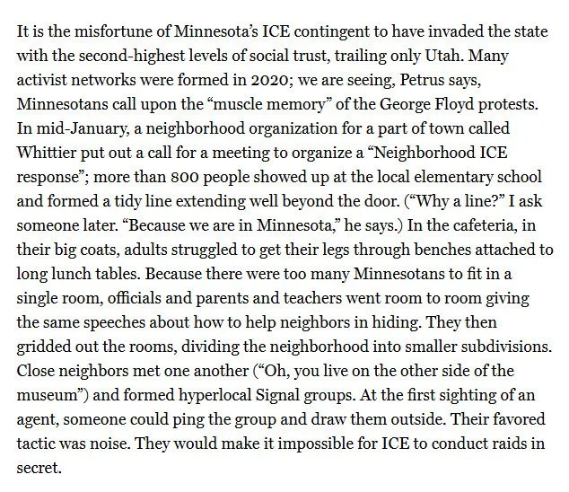 While Minnesota has torn the mask off of the fascism overtaking our Nation, it has also given us hope and a blueprint for resistance. There has been some excellent reporting from Ana Marie Cox, Emily Witt and others about the herculean resistance operations by the People of Minnesota. Wine moms transforming into rapid response legal observers, grandparents leading mutual aid food pantries and laundering efforts, neighbors demonstrating with resilience and persistence. As we contemplate those 10,000 new and poorly trained DHS stormtroopers moving into more of our cities, including our own, we look to Minnesota and know that this is the work we all will need to do. On the streets and blocks where we live and sleep. At the schools that our children attend. Groups of vigilant neighbors connected to one another and to other like-minded groups in an ever-expanding network of concentric circles in order to defend ourselves against the indiscriminate violence being used against us by a federalized goon squad.