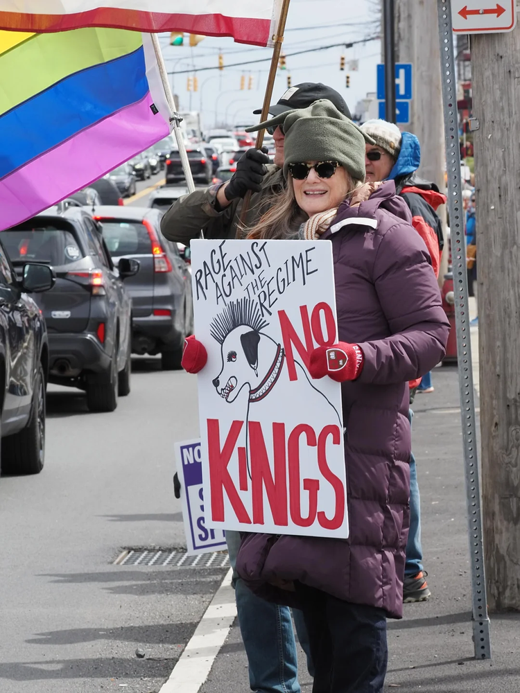 As usual, the Mighty 518 showed up in droves. Last June’s No Kings 1 on Wolf Road was huge and unprecedented, and No Kings 2 in October 2025 on Western Avenue was even bigger than that. And then, this past Saturday at Central and Colvin, you topped yourselves once again, filling the streets with decorated cars and the sidewalks with your bodies, all of you waving the most goddamn clever signage imaginable. And then there was the March on Colvin Avenue; for those of us that bore witness to thousands of you marching down the hill to join your comrades flooding Central, it was truly a sight to behold. Led by a contingent of veterans and flag bearers all marching to the beat of drums and other musicians, those of you who marched injected the rest of us with a joyous energy that rippled through the crowd like an electric current and sustained us all afternoon, despite the early-Spring cold. We can’t thank you enough, Capital Region; for your dedication, for your patriotism, for your willingness to stand in solidarity with friends and strangers alike. But the best part of it is that we know that you understand that Saturday was not the end. You know that the work must continue. We must still organize to defeat ICE, we need to register voters and get them to the polls in November, we will need to keep chipping away at the corporate pillars of the regime and taking action to defeat the expanding surveillance state. May Day is coming, and every day between now and then and thereafter will be an opportunity for all us to do one little thing to help defeat the Regime. We’re proud to stand with you, Capital Region, and we are looking forward to working with you every single day as we take our country back from the Tyrant and his minions.
